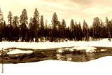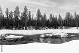 beautiful old sequoia trees under blue sky in winter landscape with small creek at sequoia tree national park