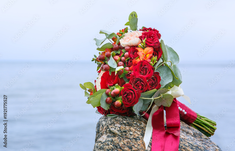 A beautiful wedding bouquet of red roses and red hypericum berries lies on a stone against the background of the sea