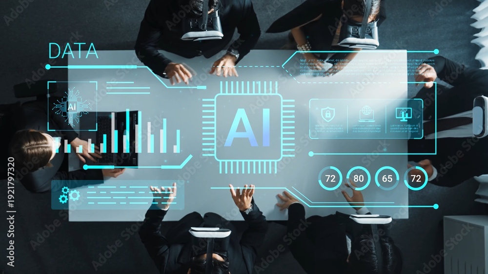 Futuristic Meeting with AI Technology Visualization and Business Professionals Collaborating Over Data Analytics Concept Gluon.