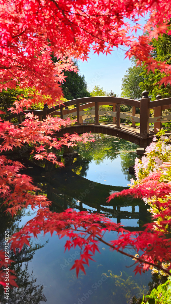Wooden bridge seen through red leaves of a Japanese maple during spring in the Hatley Park Gardens, Victoria, Canada