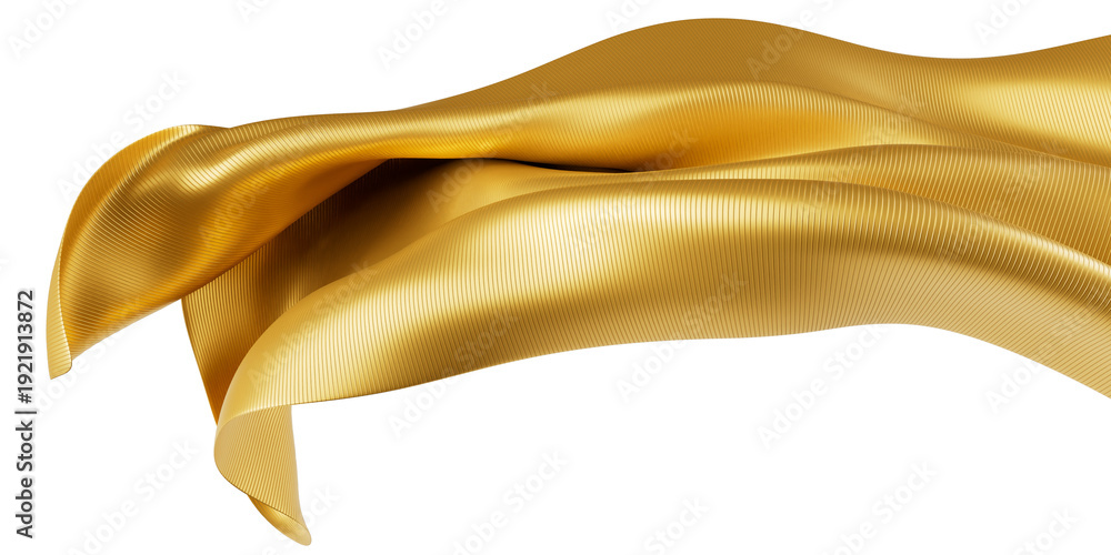 High-end gold fabric with refined self-stripe pattern flying in motion, transparent background with copy space, 3D render