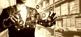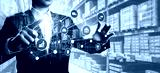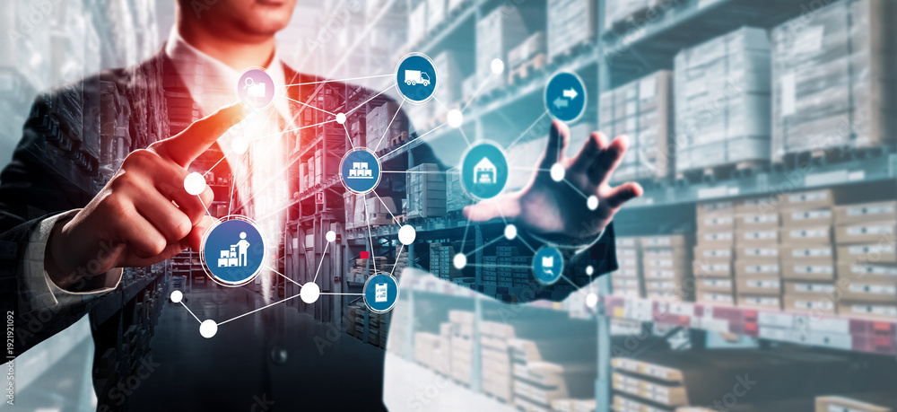 Smart warehouse management system with innovative internet of things technology to identify package picking and delivery . Future concept of supply chain and logistic network business .