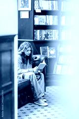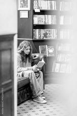 Young woman reading book with laptop on sofa in cozy library lounge interior