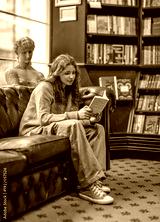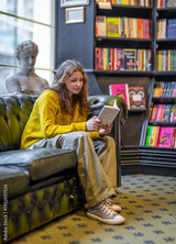 Young woman reading book with laptop on sofa in cozy library lounge interior