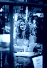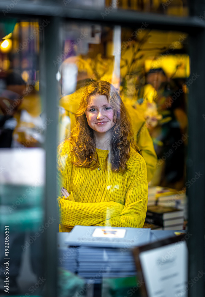 Young woman in bookstore window with stacked books and warm lights