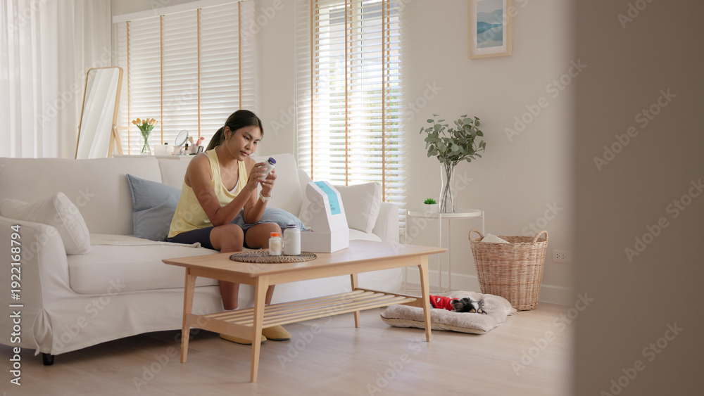 Young asia people woman buy custom tailor made anti aging pill bottle diet immune plan online health care shop open gift box weight loss herbal. Unbox order store clinic home service life balance.