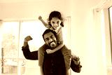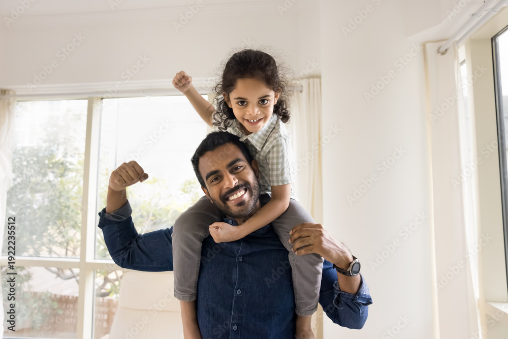 Little Indian kid boy looking at camera seated on young father shoulders, striking together playful strongman pose, showing off their arms muscles. Fatherhood, wellness, healthy and sportive lifestyle
