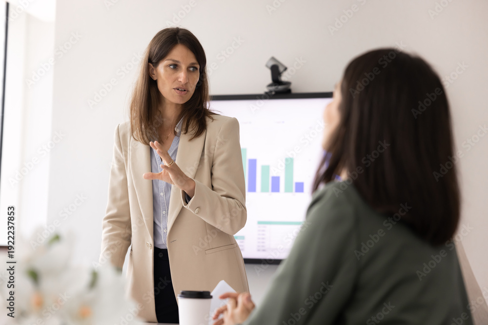 Confident businesswoman standing and talking during meeting in office, clarifying corporate goals for staff, provide contract details, making presentation, leading formal discussion. Public speaking