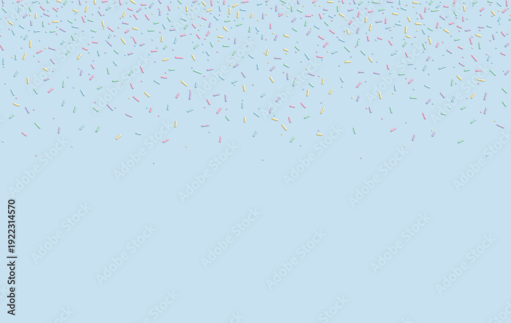 Soft pastel confetti sprinkles scattered on light blue background with copy space