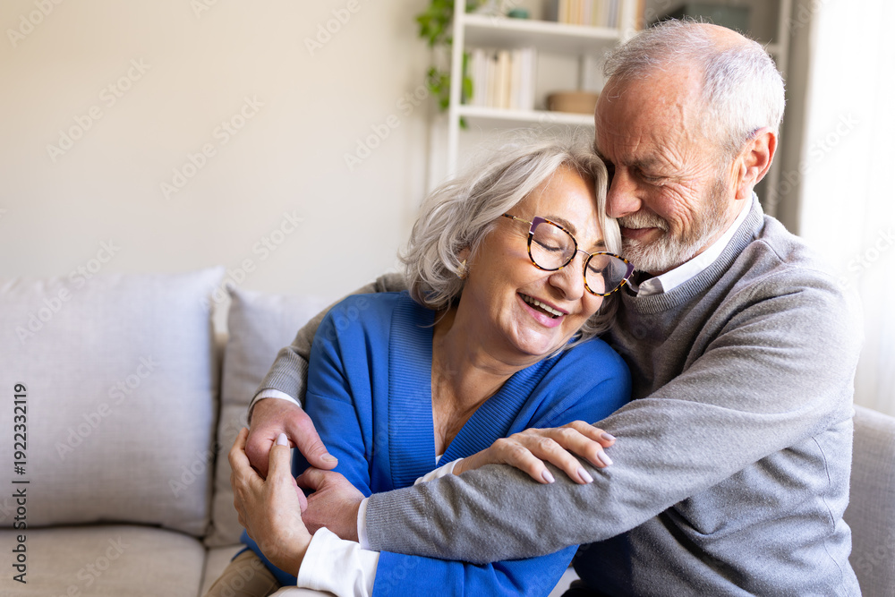 Happy senior couple embracing on sofa at home, enjoying retirement