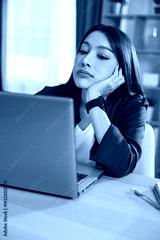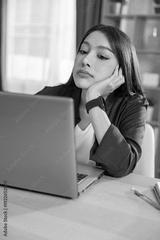 Portrait of bored asian woman feeling tired and unmotivated while working on laptop computer at home office desk looking away with unhappy and exhausted expression Vertical