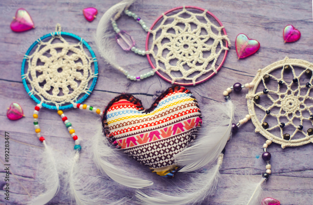 Dreamcatcher with feathers on a wooden background. Ethnic design, boho style, tribal symbol.Textile heart of handmade with ethnic ornament on a grayish old aged background.