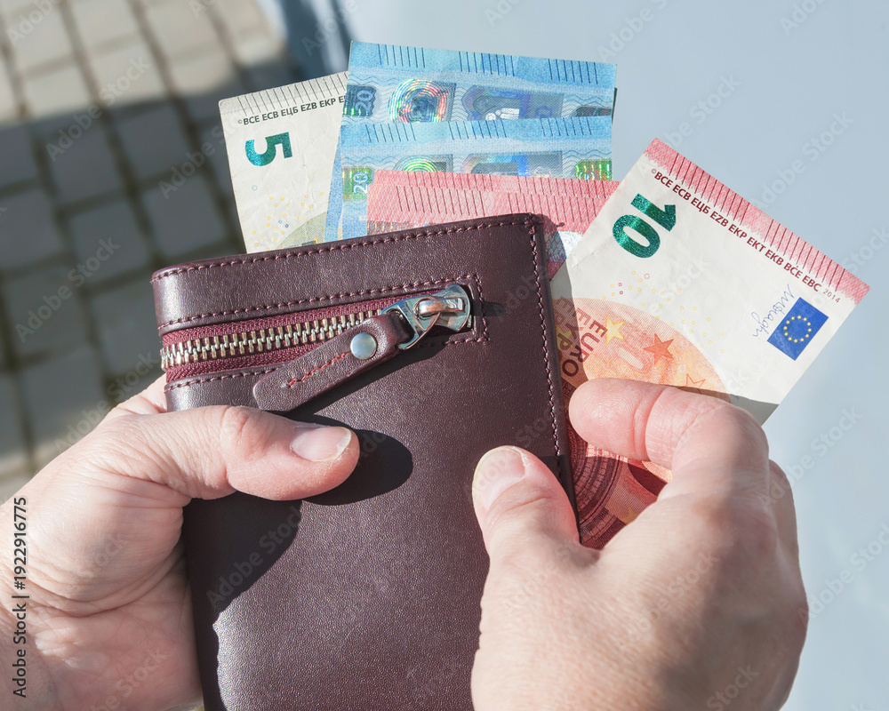Leather wallet and euro banknotes in a woman's hands, selective focus.