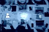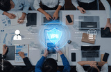 A diverse team collaborates in a modern workspace with laptops, showcasing digital security through a VPN overlay, highlighting teamwork and technology blend. Trope