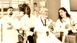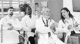 Eldery male doctor listening to lecture and watching presentation with colleagues in lecture hall