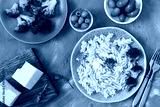 Pasta with sauce and broccoli are served with Parmesan cheese and olives on a grey background. The view from the top.