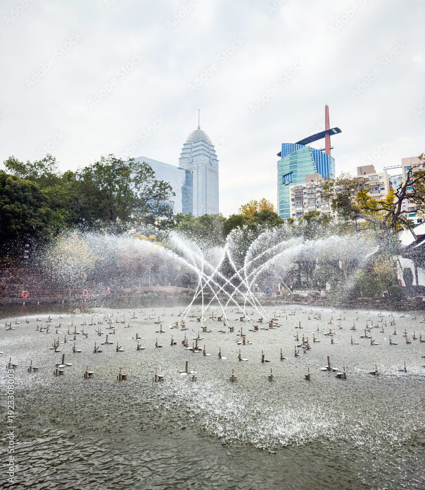 Captivating Urban Fountain Display Amidst City Skyscrapers