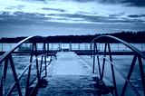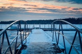 Afternoon winter landscape. A pier over a beautiful frozen lake.