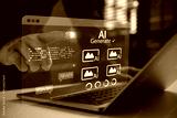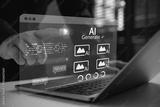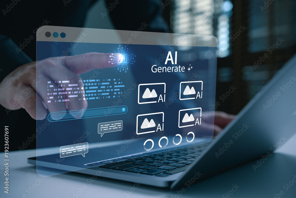 Business person using generative AI interface on laptop to create digital images. Futuristic technology concept for artificial intelligence, machine learning, and modern creative software solutions.