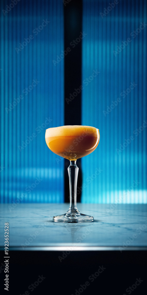 Modern design. Golden foam cocktail in coupe glass on blue backdrop. Concept of contemporary mixology trend, creative drink campaign and stylish bar branding content.