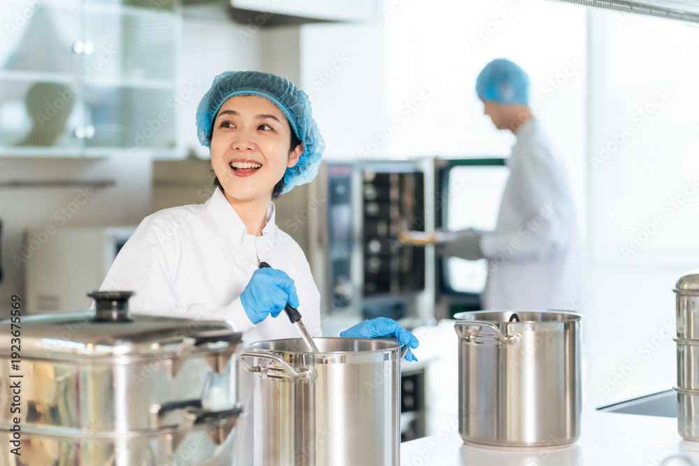 厨房、キッチン、女性、調理、給食センター、宅食、飲食店、料理、調理師、衛生、白衣、学校、社食、学食、献立、メニュー、大鍋、管理、ヘアネット、手袋、蒸し器、スープ、カレー、工場、仕事、アルバイト、パート、ビジネス、開業、おばさん、ミドルエイジ、日本人、バックヤード、店舗、レストラン、食堂、働く、帽子、笑顔、楽しい、ポジティブ、元気、加熱、栄養士、明るい、調理室、料理教室、フード、食品、人物