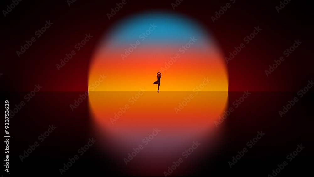 Vibrant poster. Silhouette in tree pose against glowing sunset circle. Concept of strength and flexibility, balance training, mindfulness discipline and holistic lifestyle inspiration.