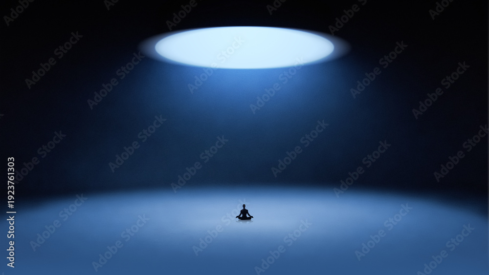 Minimal design. Silhouette meditating beneath circular ceiling light. Concept of mental clarity and focused awareness, quiet discipline in controlled modern space.