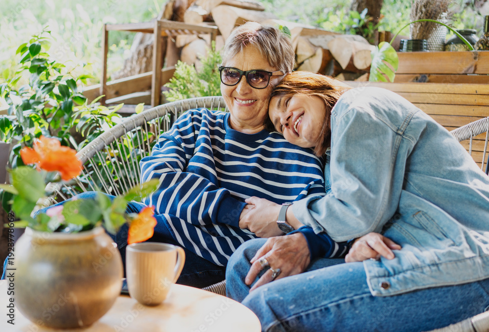 Happy senior mother and adult daughter laughing and hugging on a sunny home terrace