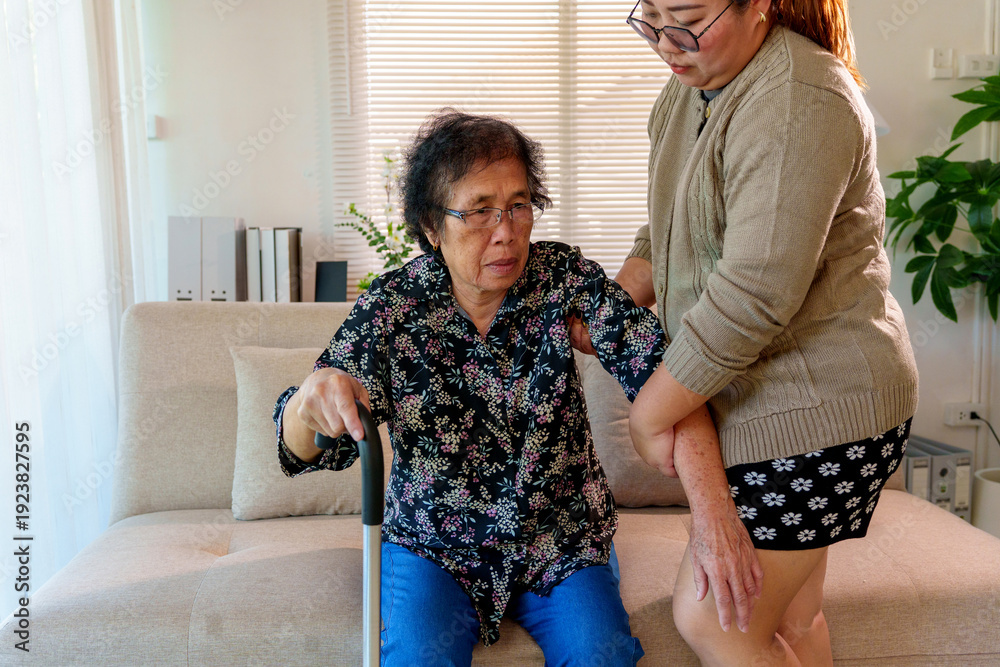 Young woman home caregiver providing empathy and support helping an elderly woman with walking stick getting up from sofa