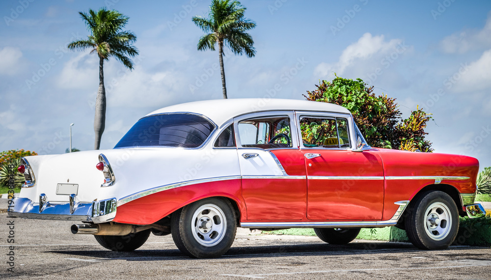 Rot weisser amerikanischer Oldtimer parkt unter blauem Himmel in Varadero Kuba - HDR - Serie Cuba Reportage
