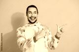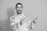 Playful man in pastel unicorn pajama jumpsuit smiles while pointing at the bright yellow background