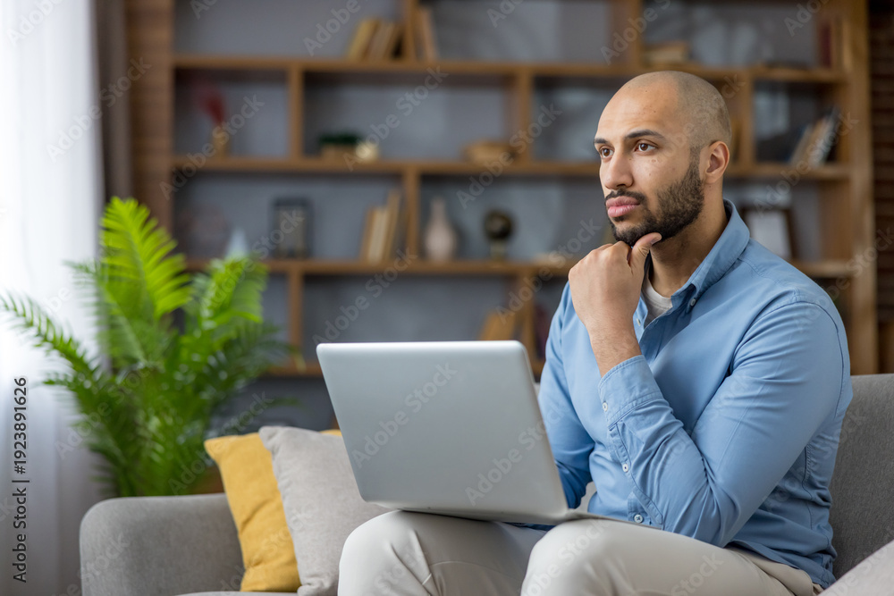 Young adult man on a sofa with a laptop, looking away while contemplating ideas, problem-solving, and strategizing for his remote work from a comfortable home office environment