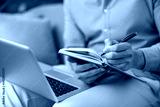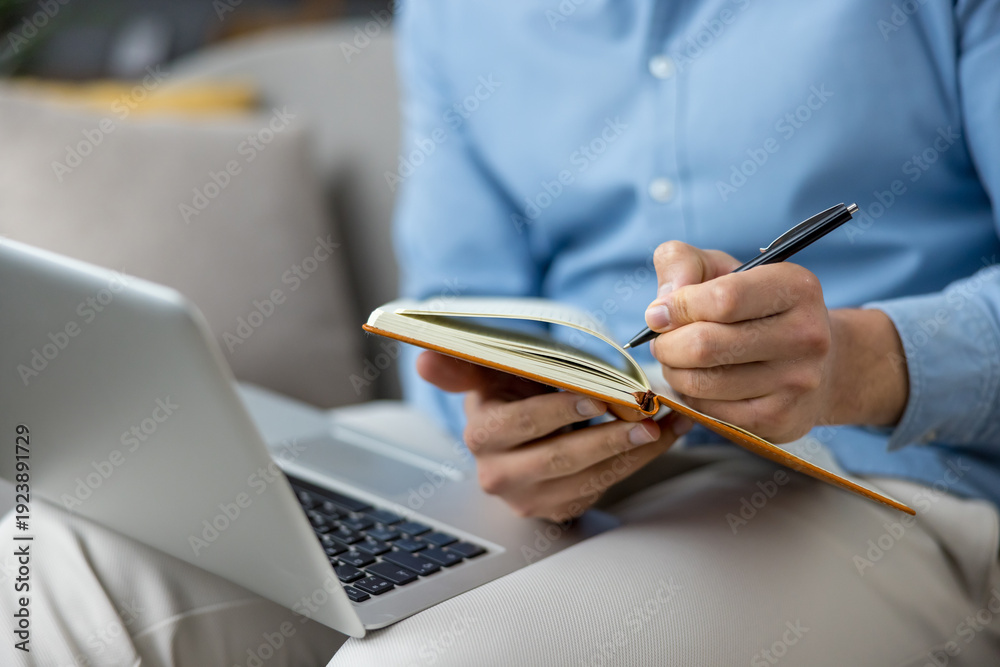 Man holding an open notebook and writing notes with a pen while sitting with a laptop on his lap, focusing on work, planning, and remote learning concepts