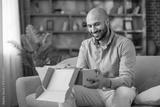 Cheerful customer receiving and unboxing a delivery package from an online store, a joyful e-commerce shopping experience at home, sitting on a comfortable sofa
