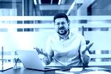 Businessman looking confused and shrugging at a laptop, experiencing a technical issue or misunderstanding while working in a modern office with glass walls