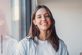 Portrait headshot of a confident, positive woman smiling naturally at the camera near a window, happy successful businesswoman or student posing for a professional profile photo