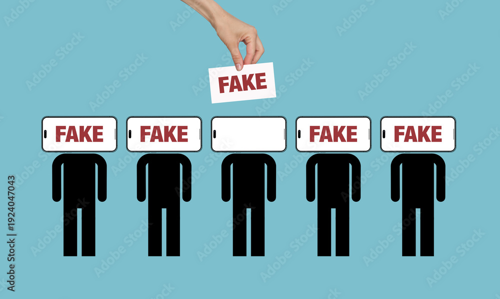 Hand placing Fake label on a digital person's head - Concept of misinformation and deepfakes