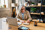 Busy entrepreneur working in office browsing laptop. Serious businesswoman using computer writing in copybook at modern workplace. Elegant woman manager developing investment project indoors.