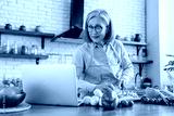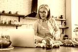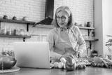 Smart eating. Confident senior woman wife using laptop online app website to find healthy salad recipe search meal idea online in culinary blog when cooking natural vegetable food at home kitchen.