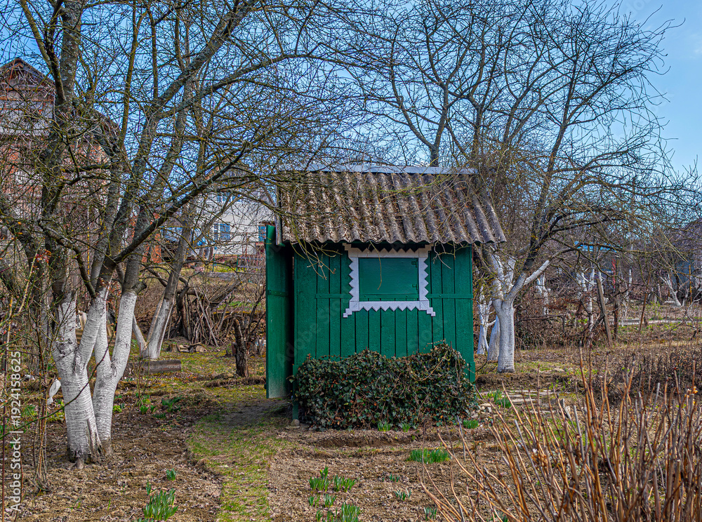 Small green wooden shed with a decorative window frame sits nestled among leafless trees in a rural garden under a clear blue sky.