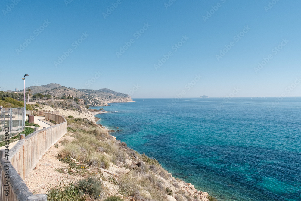 Coastal Walking Path Along the Mediterranean Sea with Wooden Fences and Boardwalks, Winding Through Cliffs from Playa Torres to Villajoyosa, Spain.