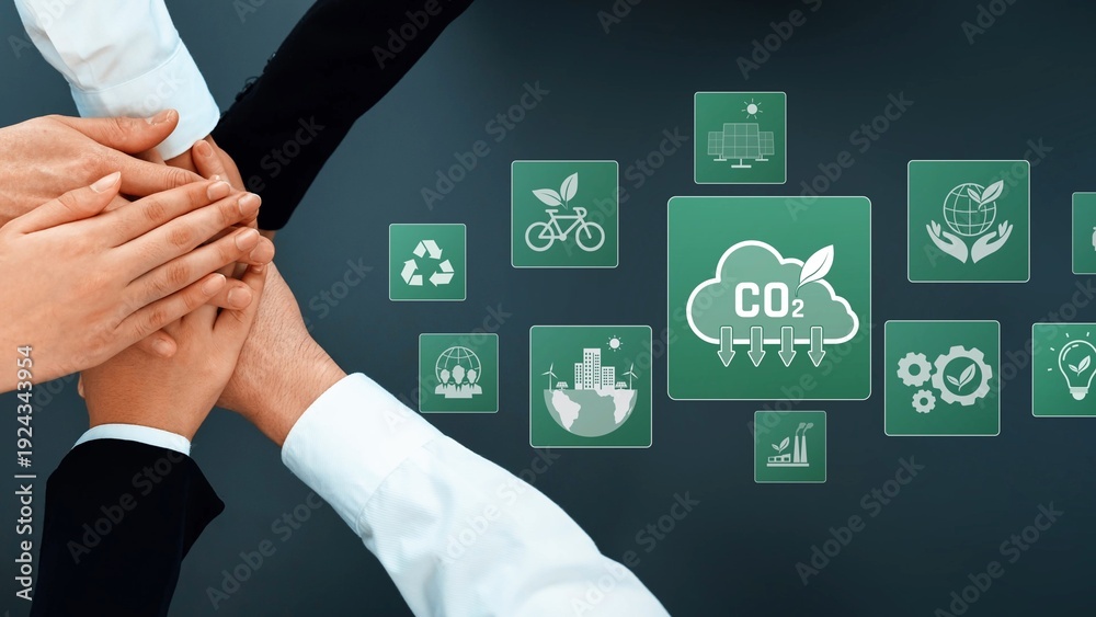 A diverse group of hands joins together to symbolize teamwork and collaboration in a professional setting, promoting sustainability and environmental awareness through innovative solutions. Raster