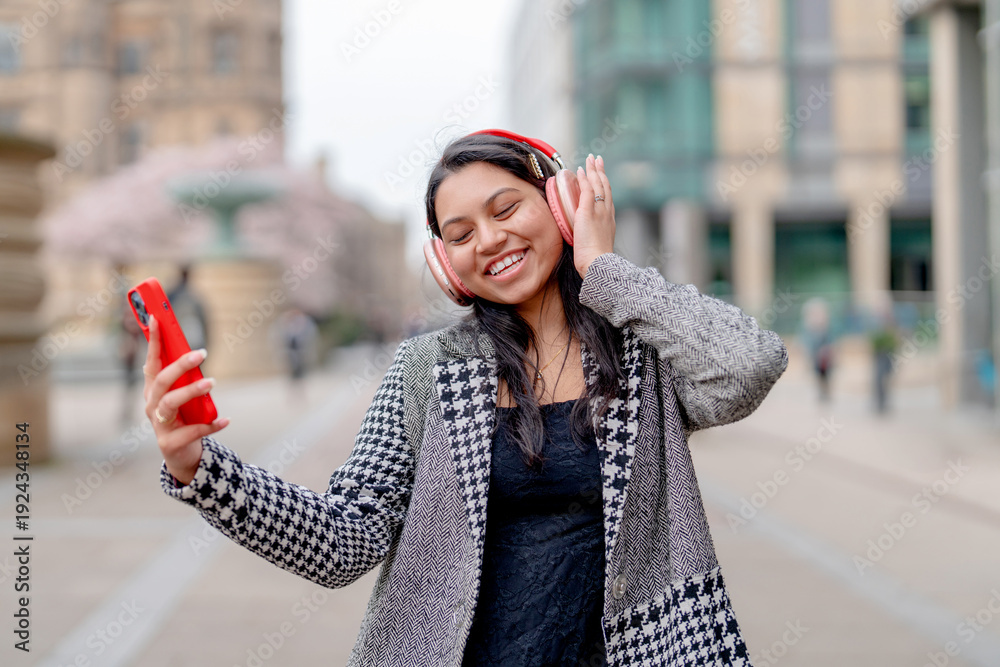 Woman enjoying music while walking on a city street during a cloudy day in spring