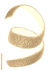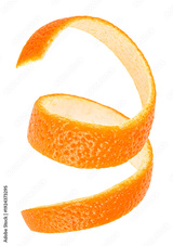 Vertical image of fresh orange peel isolated on a white background. Single twisted orange skin. Vitamin C.