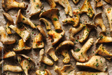 Raw oyster mushrooms in an aromatic marinade, ready for grilling, top view. Mushroom background