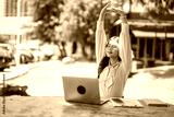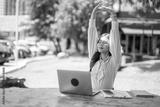 Businesswoman stretching outdoors during freelance work break