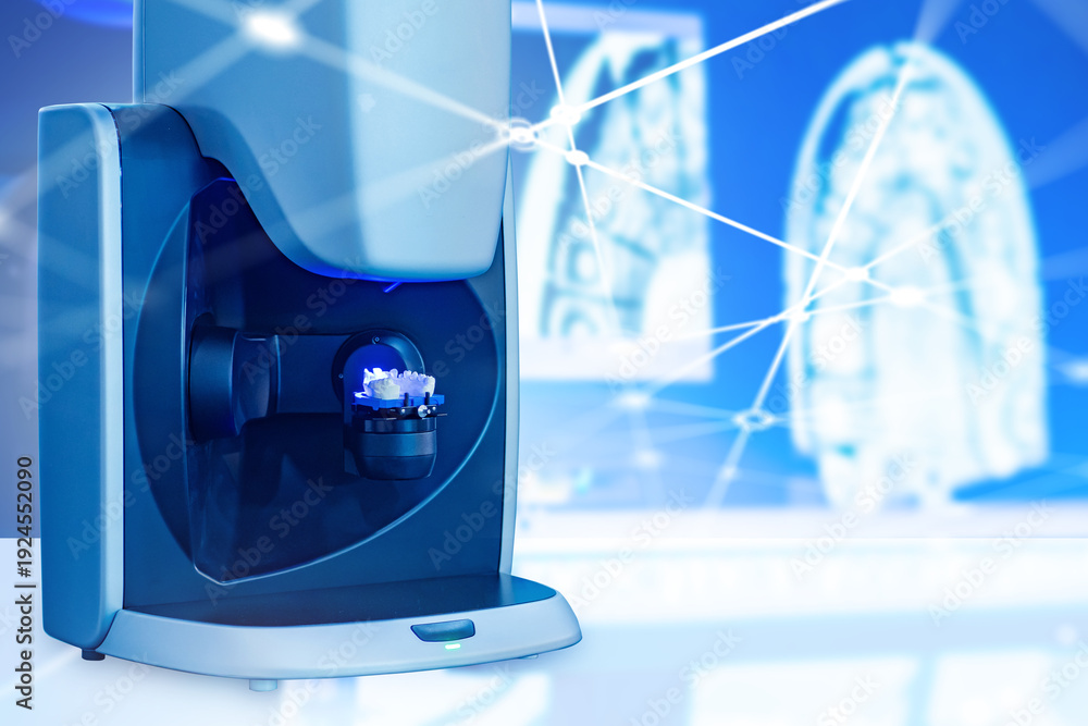Digital dentistry, Medical technology. Automated dental milling machine produces ceramic crown using CAD CAM system for precise prosthetics and modern dental treatment.