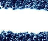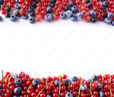 Ripe blueberries, blackcurrants and red currants. Berries at border of image with copy space for text. Background berries. Top view. Various fresh summer berries on white background.