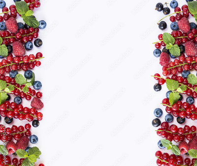 Berries at border of image with copy space for text. Top view. Ripe red currants, strawberries, raspberries, blackberries, blueberries and blackcurrants on white background.