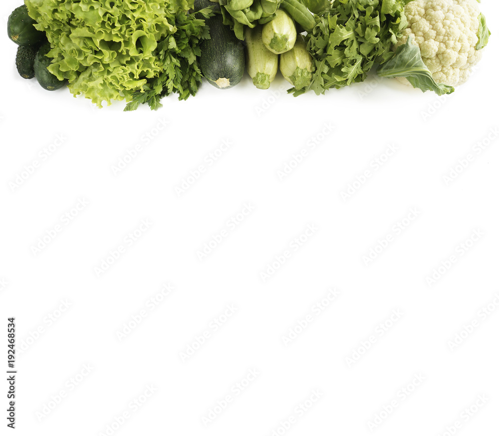 Top view. Variety of green vegetables and fruits on white. Cucumber, cauliflower, zucchini, arugula and lettuce on a white background. Vegetables at border of image with copy space for text.